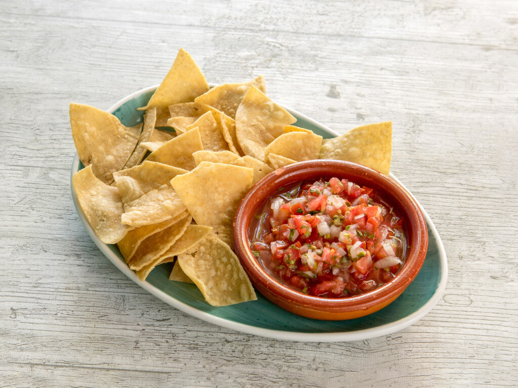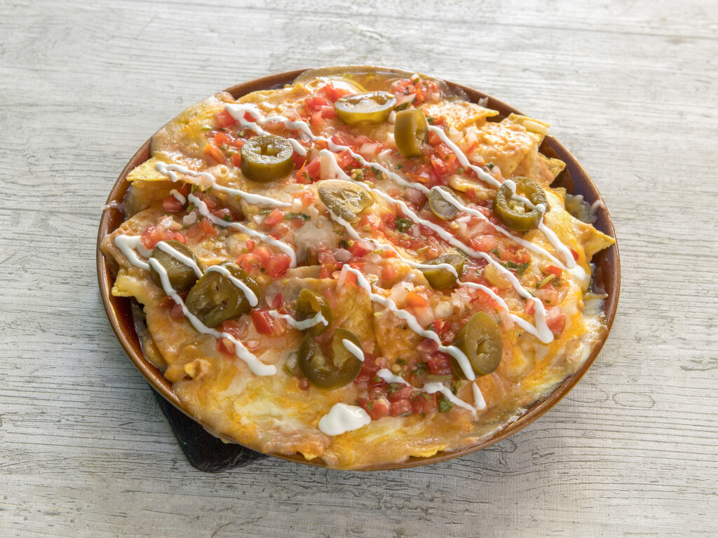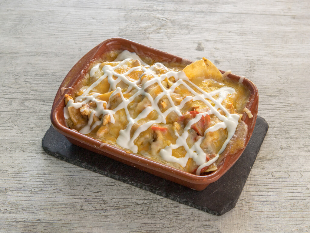 totopos artesanales + pollo + crema + salsa + queso gratinado